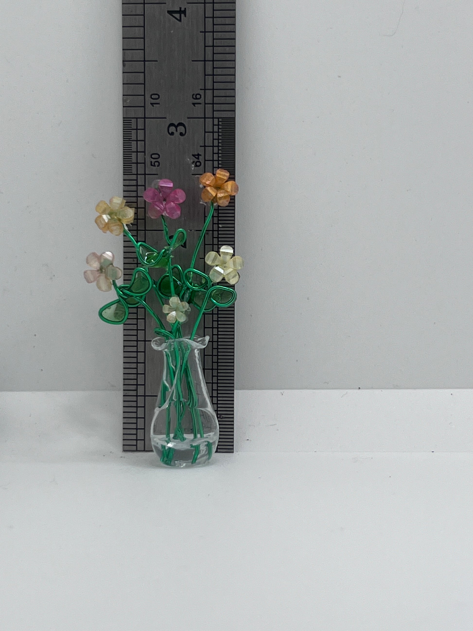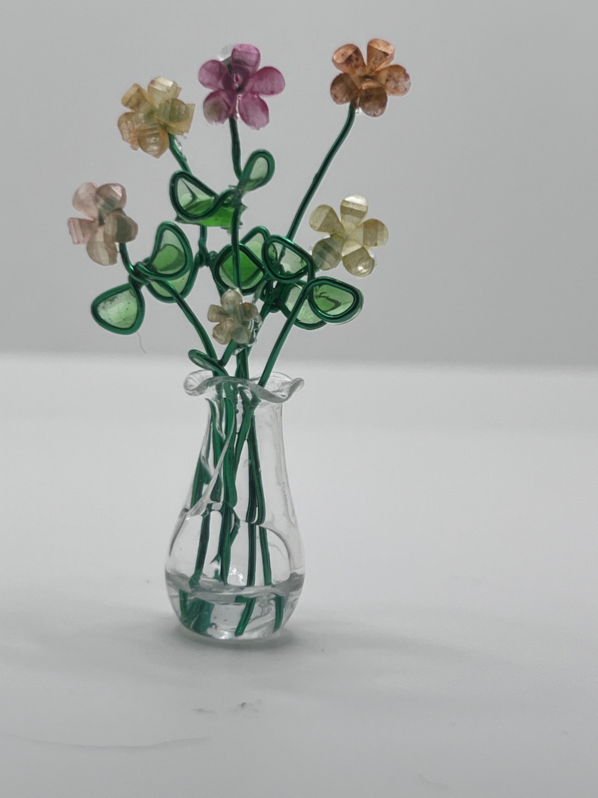 This sweet little bouquet of blossoms will make you smile every time you see it! It is a lovely collection of flowers made by my hand out of UV resin and wire. The vase is glass and UV resin is used to hold the stems in place and on the bottom to help the vase stand properly.
