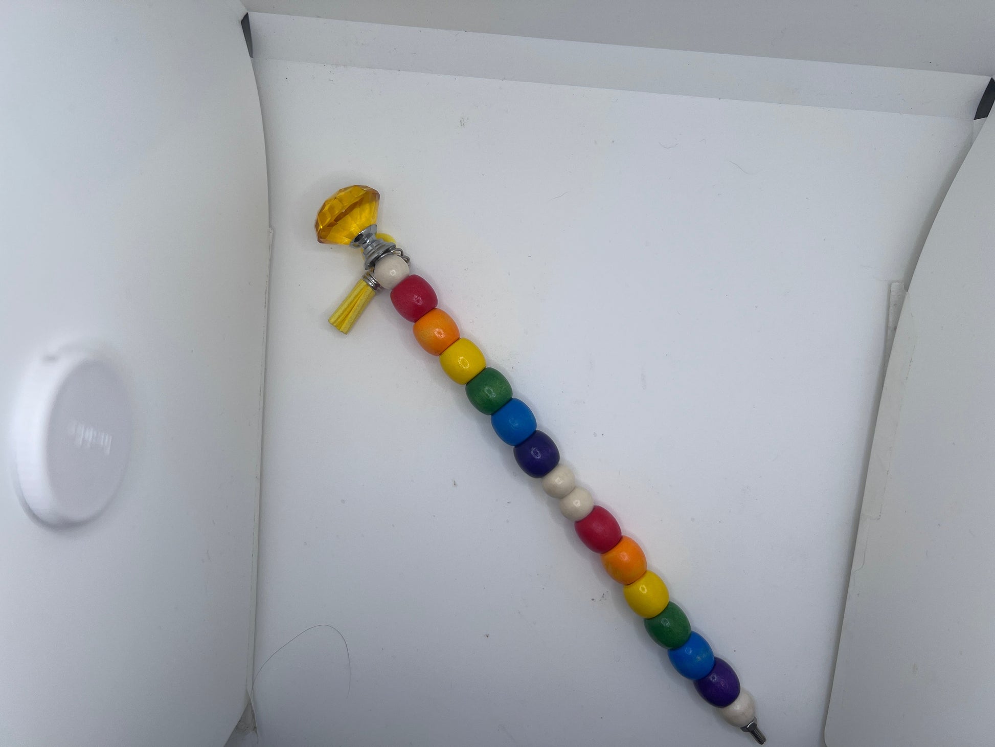 This decorative rod with rainbow colored wooden beads and a large yellow plastic crystal gemstone on top will bring magic to your garden or potted plant or it can become a magic wand in the hand of your favorite fairy or witch or wizard!