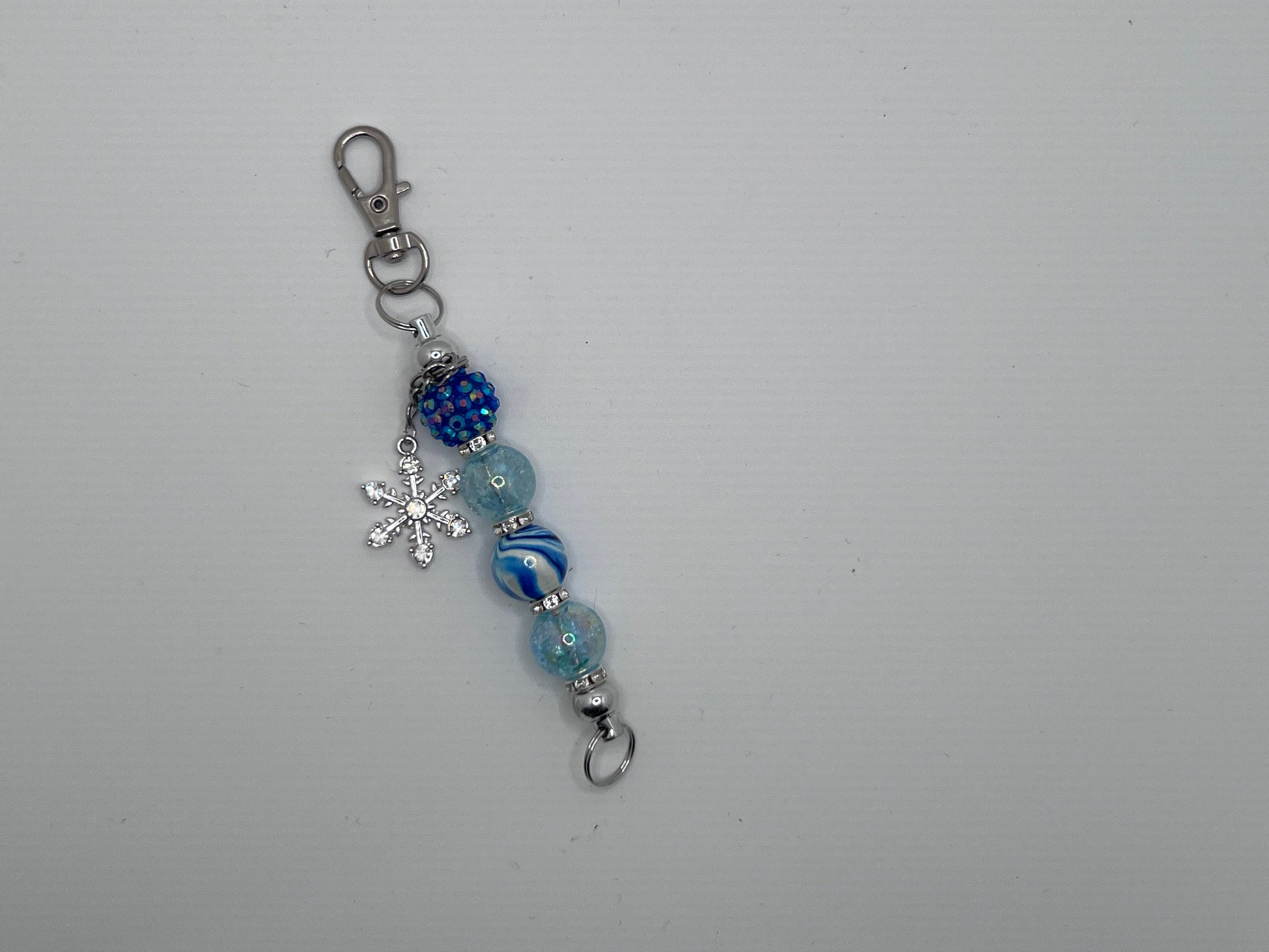 Handmade by me out of a metal rod with endcaps that are super-glued on to make it last. It has beautiful blue plastic beads and metal and crystal spacer beads. It has a silver keyring on both ends, a lobster clasp with a metal and crystal snowflake dangling from one end.
