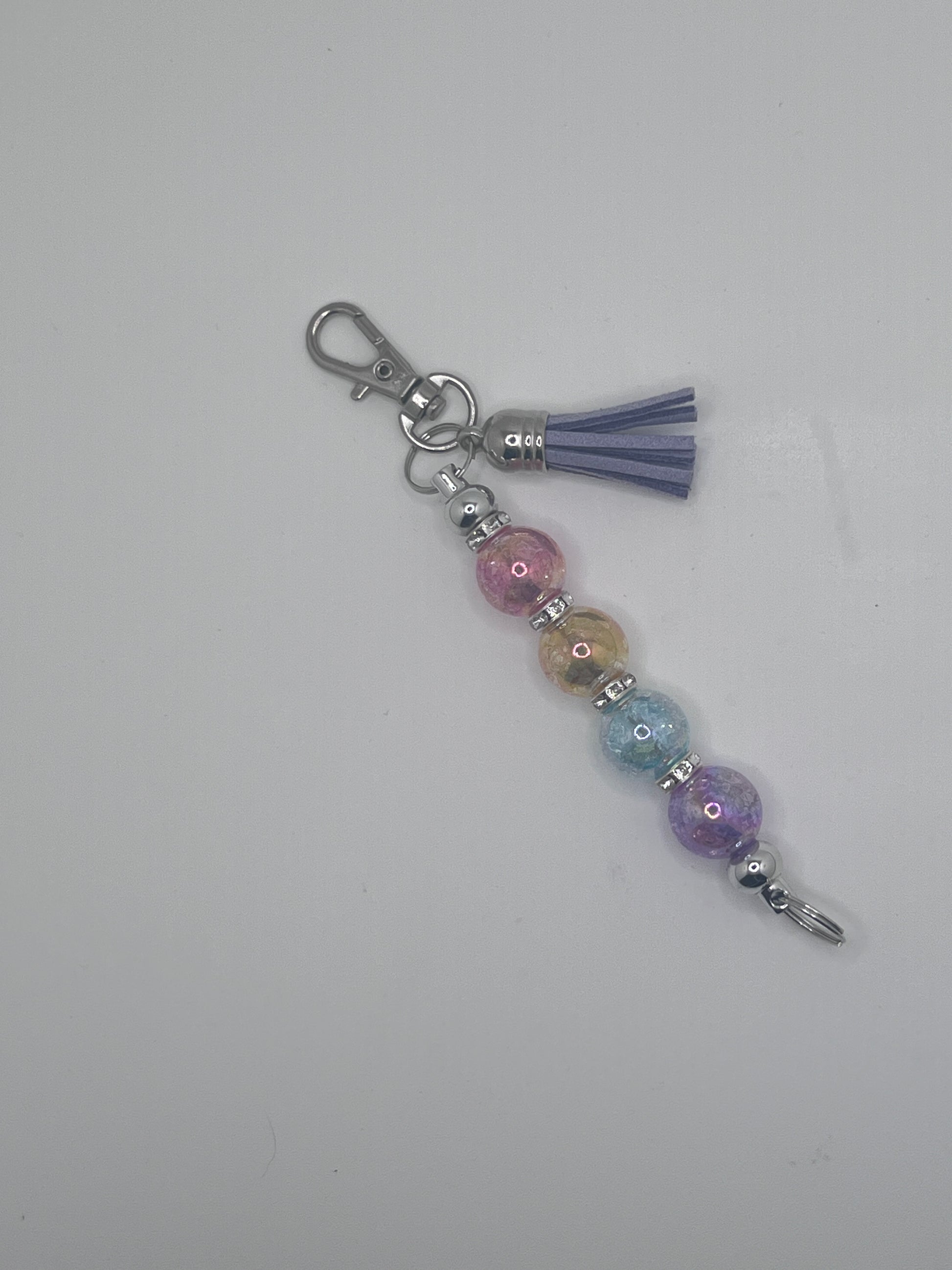 Handmade by me out of a metal rod with endcaps that are super-glued on to make it last. It has beautiful iridescent purple, blue, yellow and pink plastic beads with metal and crystal spacer beads. It has a silver keyring on both ends with a lobster clasp and a purple leather tassel dangling down on one end.