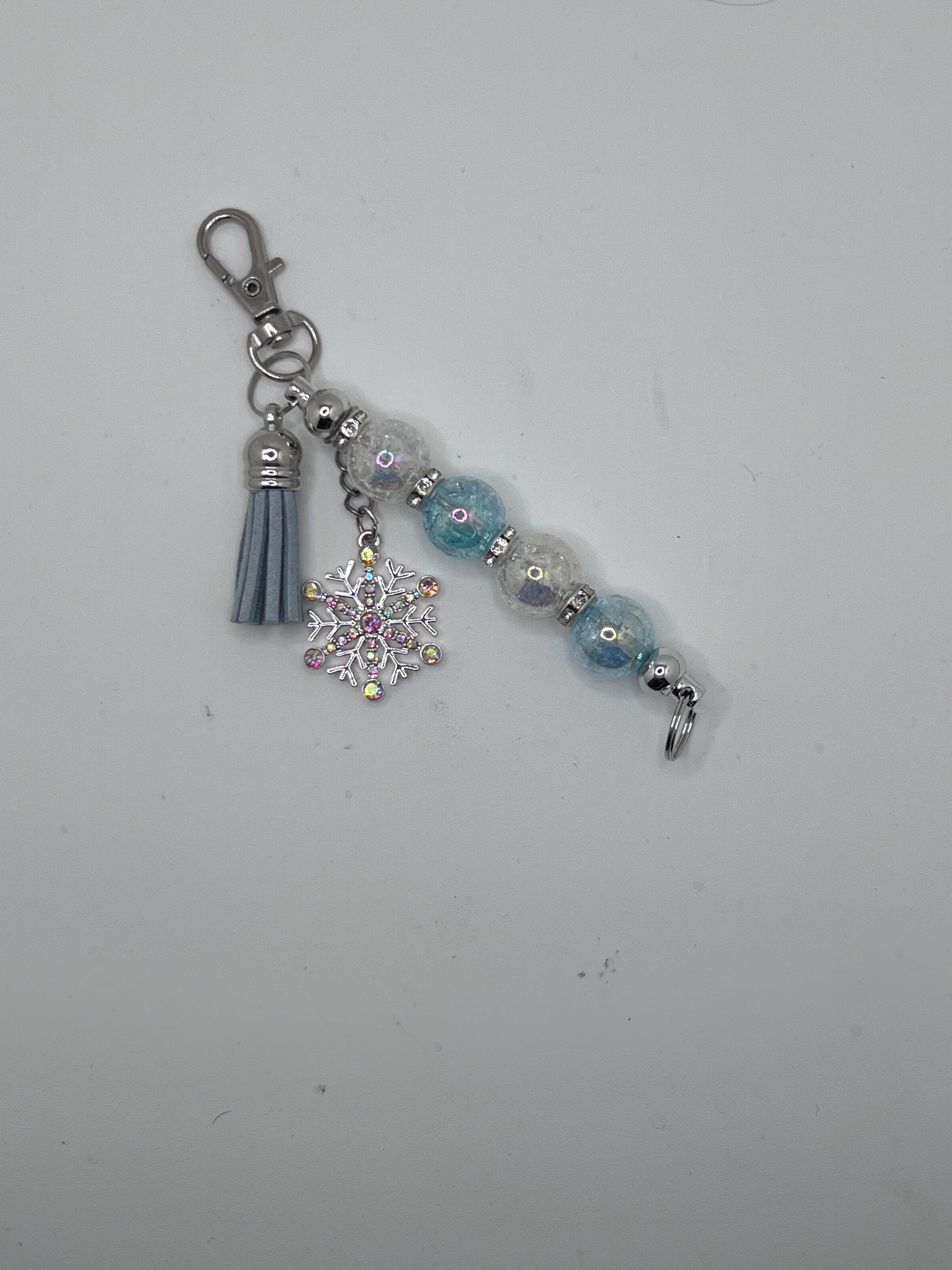 Handmade by me out of a metal rod with endcaps that are super-glued on to make it last. It has beautiful blue and white plastic beads and metal and crystal spacer beads. It has a silver keyring on both ends, a lobster clasp with a metal and crystal snowflake and a blue leather tassel dangling from one end.